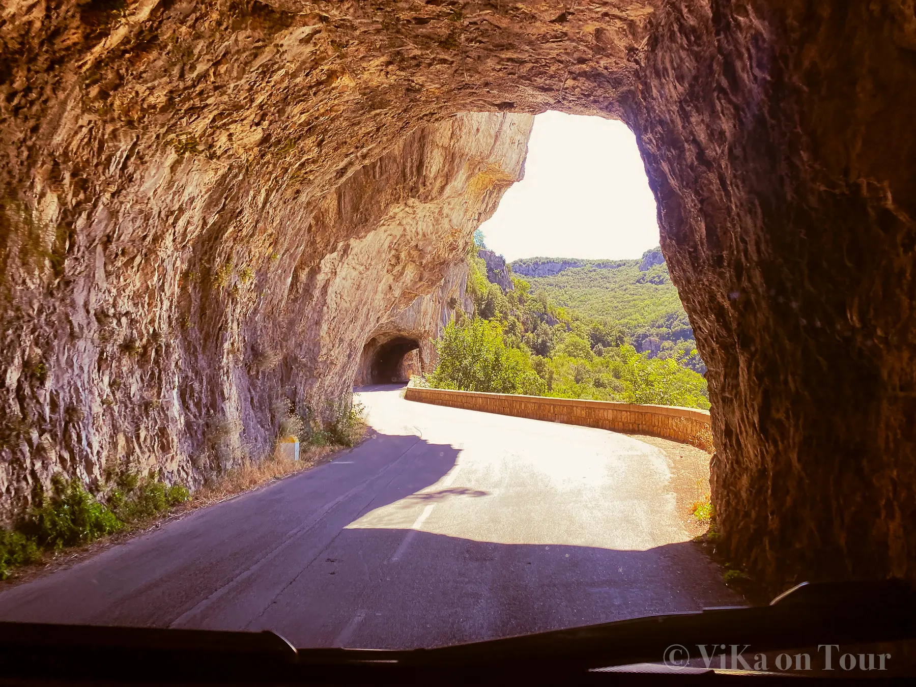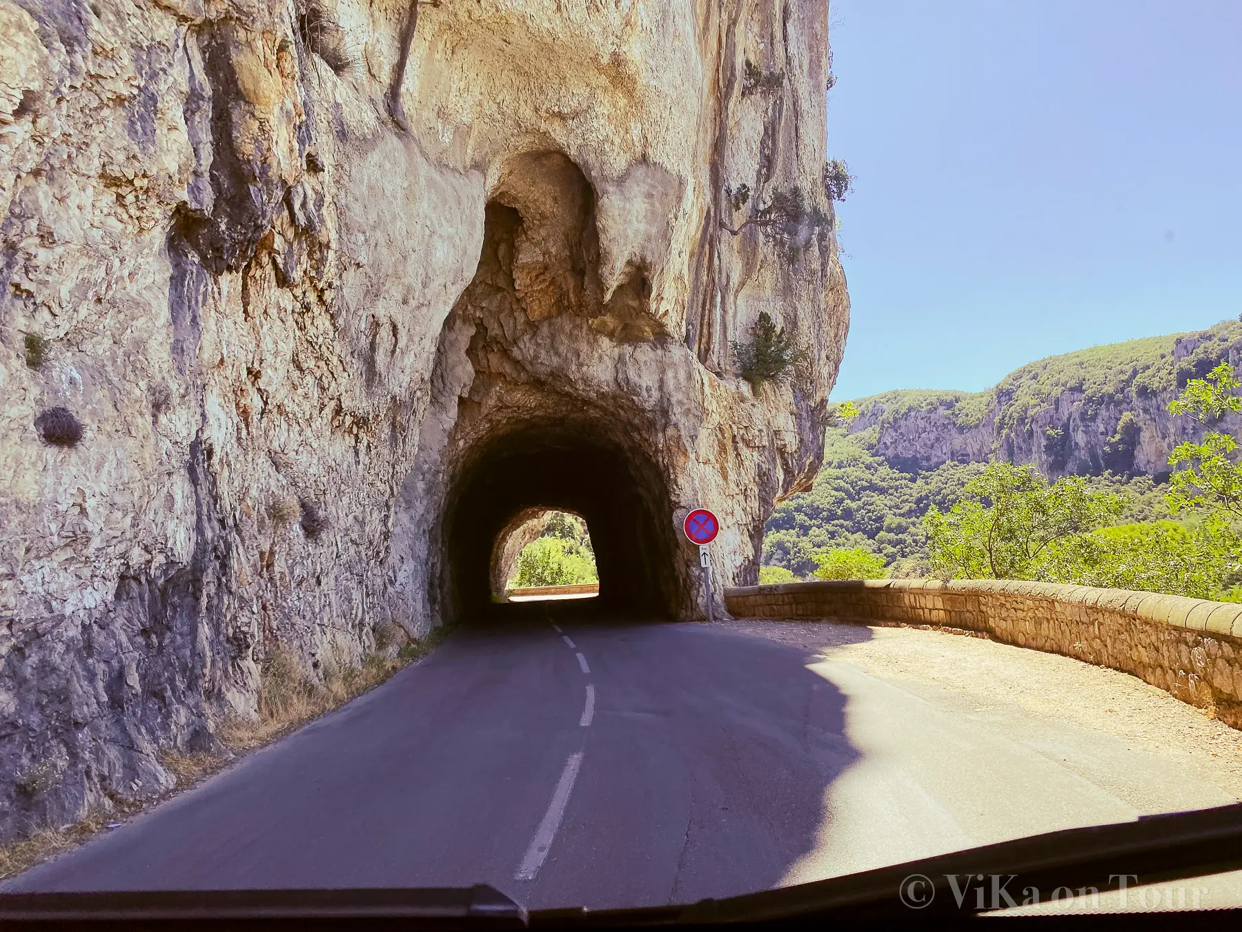 Anschließend wollten wir nachmittags zum Pont d’Arc (eine natürliche Felsbrücke) und dort ein bisschen baden. Leider machten uns die Menschenaufläufe einen Strich durch die Rechnung. Es scheint ein Megahighlight in der Region zu sein und DER Ausgangspunkt für Kanutouren. Kleinbusse karren die Touristen den Berg hoch und runter mit Kanus bepackt zu den Startpunkten der Touren. Die Parkplätze waren leider so voll, sodass kein Platz für uns langes Wohnmobil war. Unheimlich viele Autos und Camper standen bereits am Straßenrand und verengten die ohnehin schon schmalen Straßen noch ein bisschen mehr. Wir konnten beim Vorbeifahren einen Blick auf die Brücke erhaschen, für ein Foto hat es jedoch nicht gereicht.